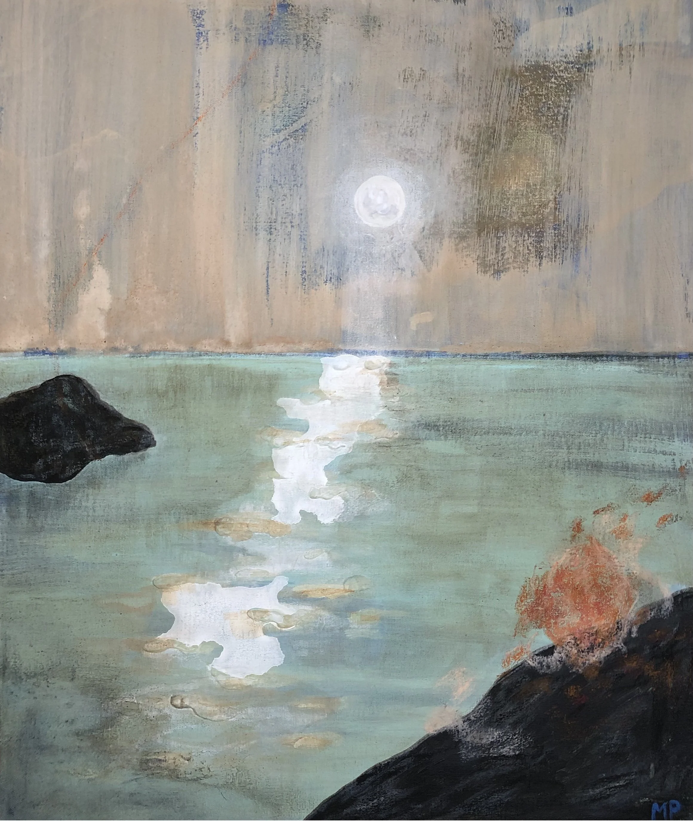 Kraft’s iridescent pigments are balanced by the sharp form of the rocks she depicts. The following paintings show a tougher side to our landscape through the hardy, rocky formations we find on Earth.