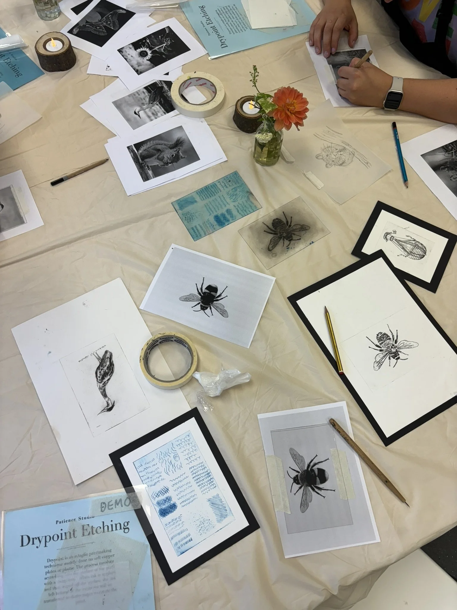 etch (or ‘scratch) your chosen image into a plastic plate. don’t worry if you’re new to drawing - we will be tracing reference images!